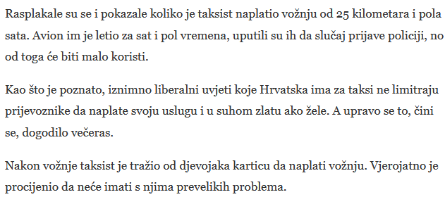 As it’s familiar, extremely liberal conditions that Croatia has for the taxi don’t limit the transporters to charge their service “like dry gold” if they want. And just that, it seems, happened this evening.