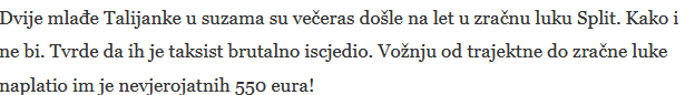Two younger Italian girls arrived at the flight at the airport Split in tears. How wouldn’t they. They claim that the taxi driver has brutally “squeezed them out”. He charged an unbelievable 550 euros for the ride from the airport to the ferry port.